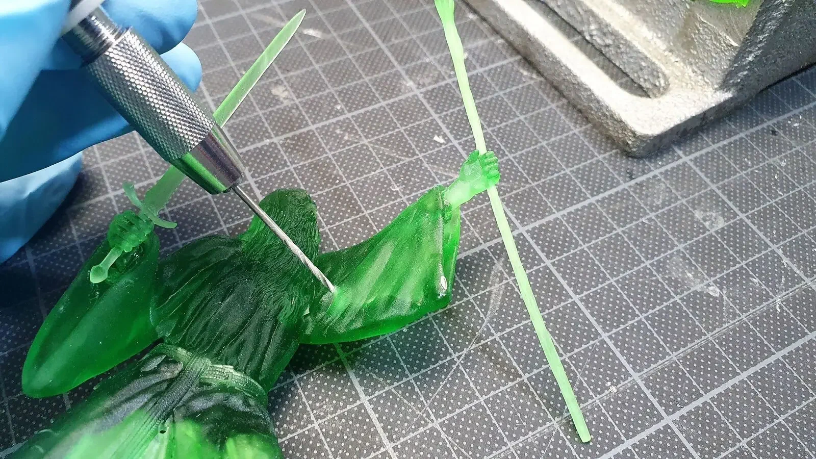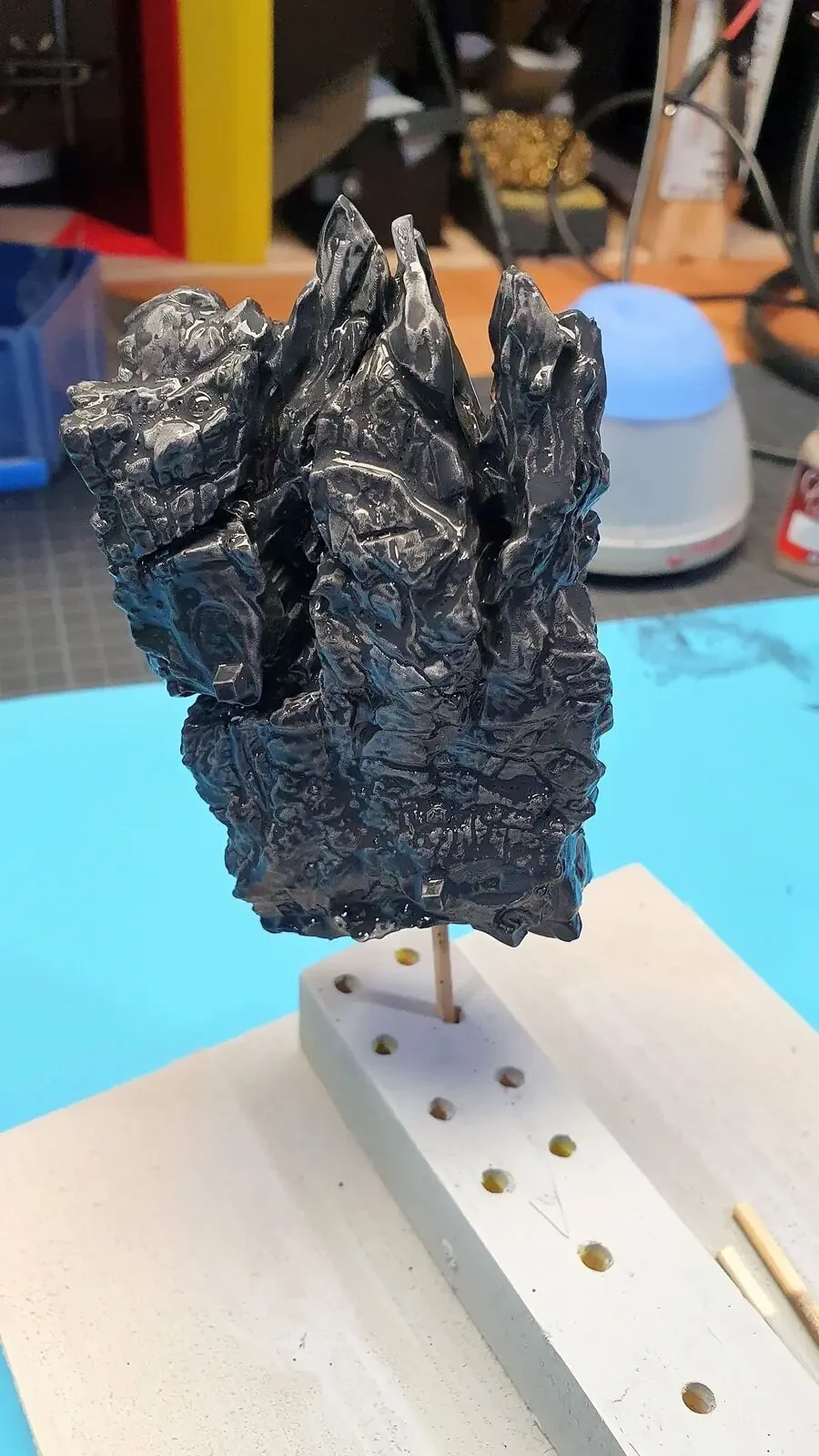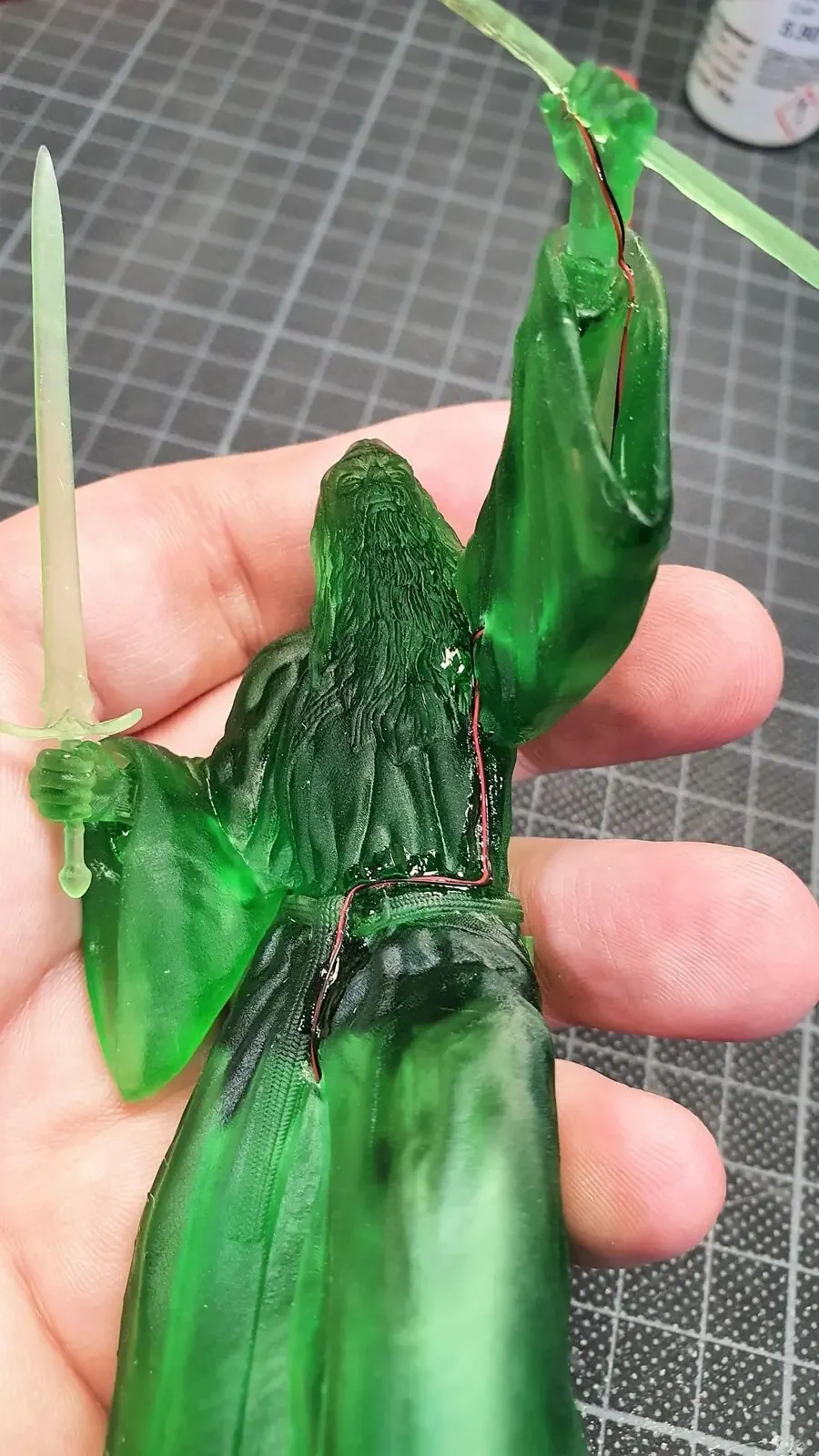 Zudem habe ich seinen Stab mit einem Micro-LED versehen und mit sehr viel Geduld die Kabel verlegt sowie eine Öffnung in die Base gemacht. Damit diese Veränderungen nicht auffallen, habe ich diese mit Milliput “Weggespachtelt”.