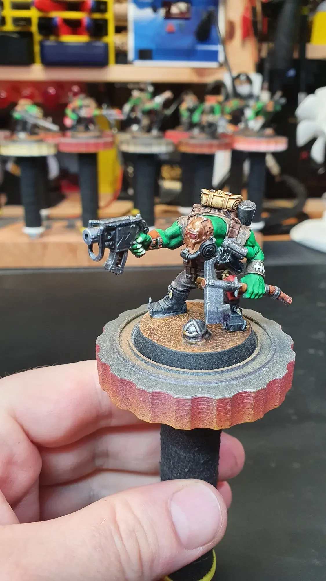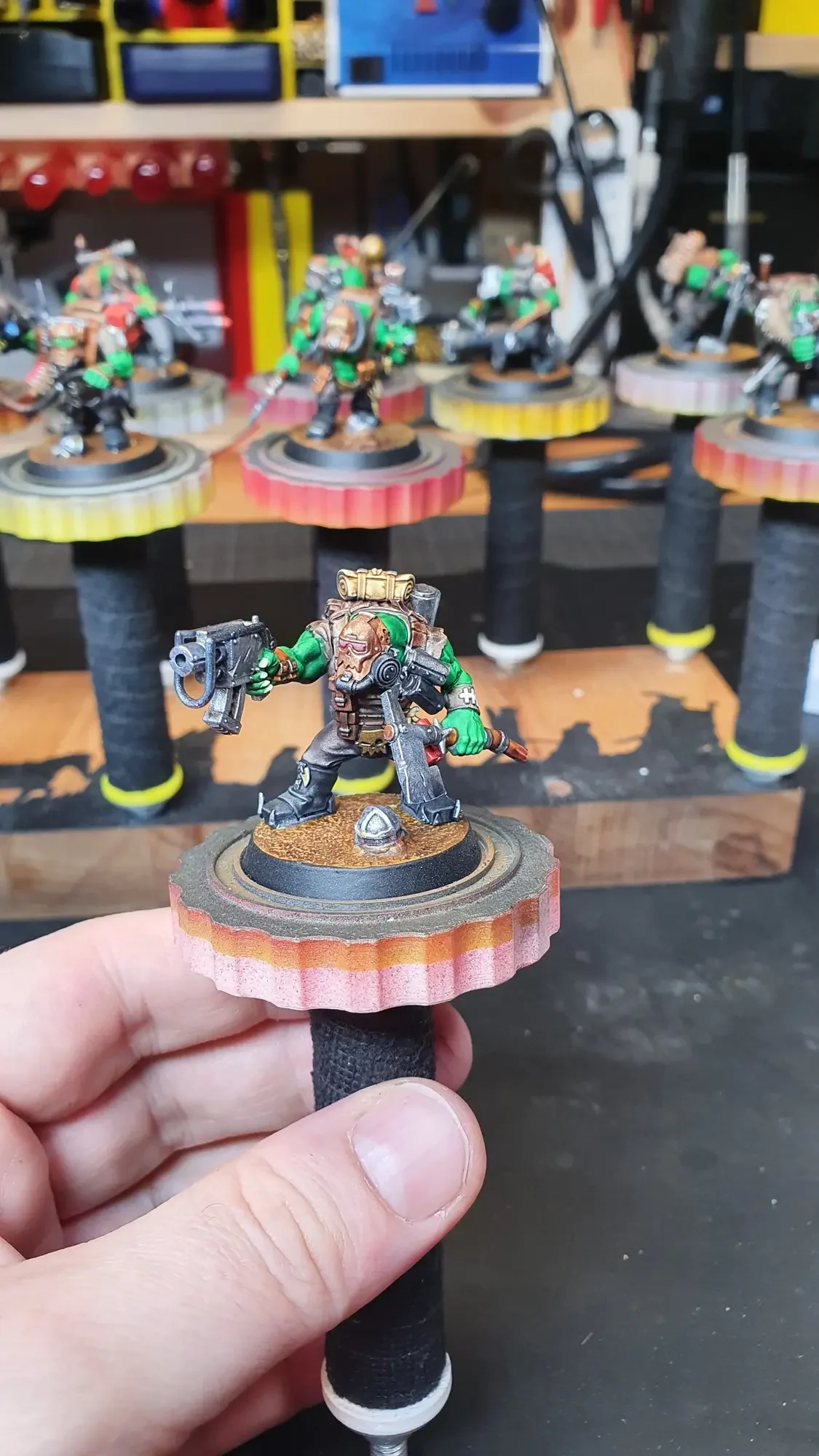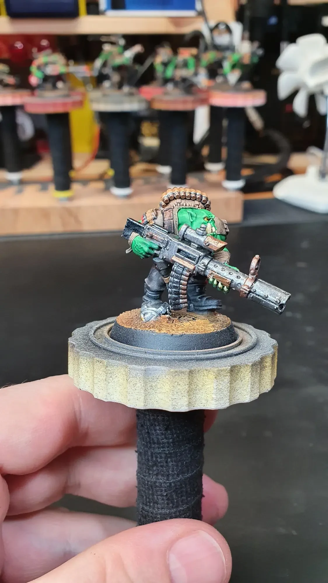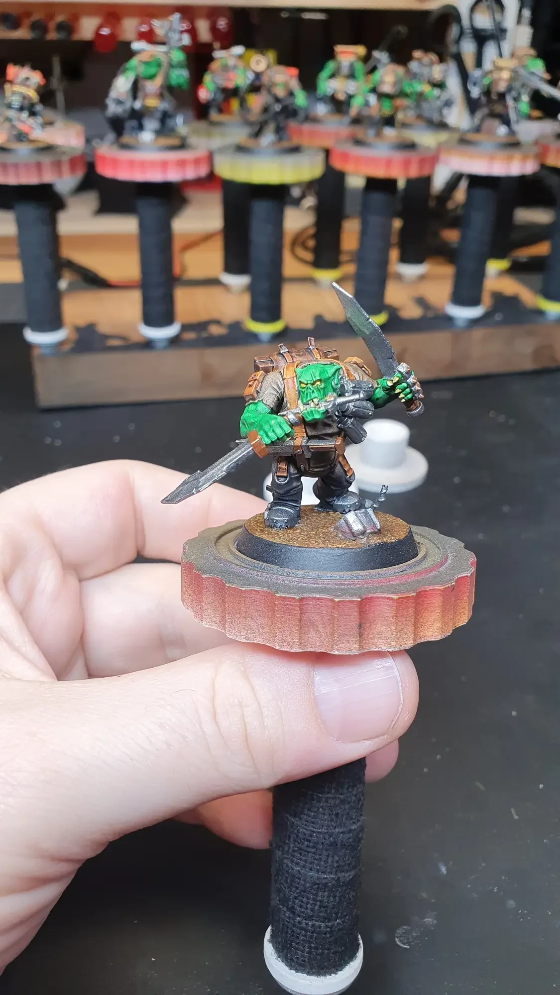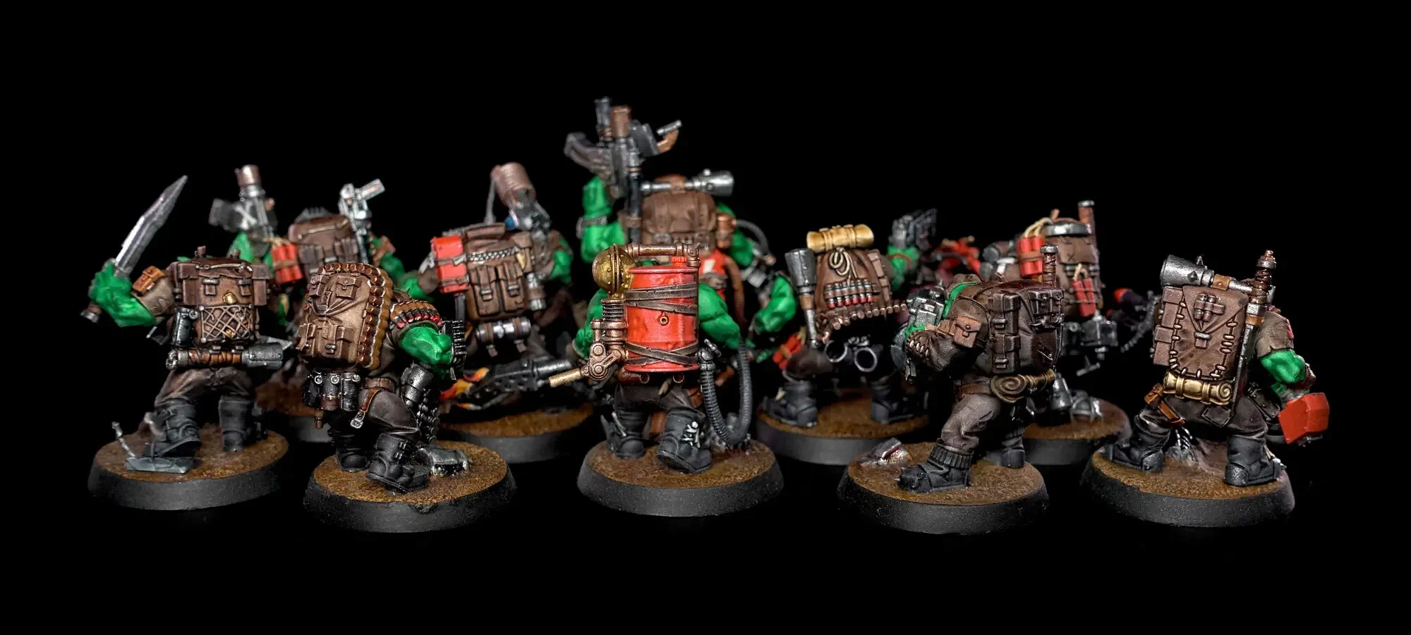 Aus der Kill Team Box Octarius von Games Workshop stammen die Ork Kommandos. Die reinen Mal-Arbeiten dauerten ca. 20 Stunden. Am Anfang ging es dank den Speed-Paints relativ schnell, aber all die Details der 12 Modelle dann hervor zu heben dauerte schlussendlich viel länger als erwartet.